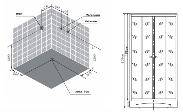 Lieferumfang: Wie oben beschrieben mit Warm- und Kaltwasser Anschlussschlauch, Duschtasse sowie Ablauf inkl. Anschluss. |