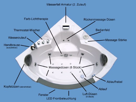 | | | Stahl Rahmen Der gesamte Pool wird von einem Stahlrahmen getragen. Mit den höhenverstellbaren Füßen gleichen Sie kleine Unebenheiten in Ihrem Bad einfach aus. | Insgesamt 29 Massage- und Luftdüsen 10 Boden Luftdüsen 4 Massagedüsen 8 Rückenmassage Düsen 4 Einstellbare Massagedüsen für Schultern u. Rücken 3 Massagedüsen für den Lendenwirbel-Bereich |