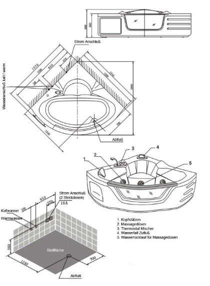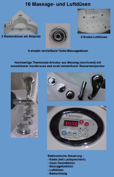 | | mit Wasserheizung nie mehr kaltes Badewasser Absolute Vollausstattung 16 Massage- und Luftdüsen Ozon-Desinfektion Thermostat-Mischbatterie 2 Unterwasser-Spots LED Beleuchtung an der Frontschürze Warmwasser Heizung mit 900 Watt Computer Steuerung FM Radio mit Lautsprechern Wasserfall abnehmbare Relax-Kopfstützen automatische Restwasserentleerung verglastes Sichtfenster in der Frontschürze |     Ausserdem bieten wir von diesem Modell 22 Stück als defekt an. Hier wurden diverse Ersatzteile entnommen. Dieser Posten eignet sich für Bastler oder Klempner. Der Gesamtpreis für 22 Stück ist 3.500,00 Euro. Also NUR 159,00 Euro/Pool | | Whirlpool AS607 für 2 Personen |  10 Massage- und Luftdüsen Ozon-Desinfektion Thermostat-Mischbatterie Warmwasser Heizung Wasserfall Handbrause abnehmbare Relax-Kopfstützen automatische Restwasserentleerung |