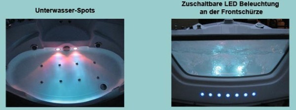 | 8 zuschaltbare LED Farblichter Oberhalb der Wasserlinie sind im Whirpool 8 zusätzliche LED Farbwechsellichter angebracht. Damit schaffen Sie zusätzliche Entspannung für Ihr Badevergnügen. |